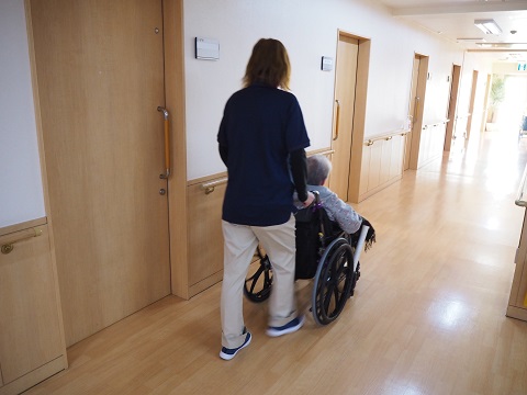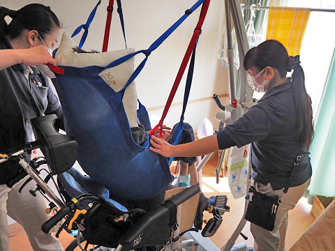 ADLに応じて車椅子に移乗して誘導したり、声掛けの対応をしています。利用者様はこのあと昼食の時間です。