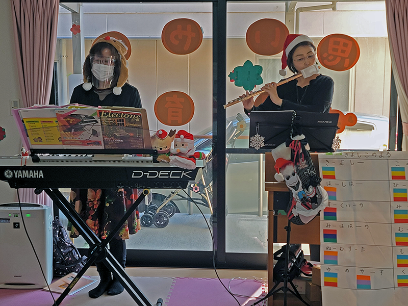 フルートやバイオリンの生演奏を聴いたり、海外の珍しい楽器に実際に触れながらリズムに合わせて体を動かすことで運動機能の向上を図ります。さらに、講師の先生や他児と一緒に演奏することでコミュニケーション能力の向上につながるなど、音楽療法には様々な効果が認められています。